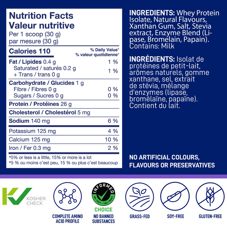 Ingredients: Whey protein isolate, Natural flavours, Xanthan gum, Salt, Stevia extract, Enzyme blend (Lipase, Bromelain, Papain).